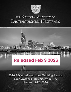 Held every 2 years, the NADN Advanced Training Retreat has become the most anticipated professional and social event on the calendar for experienced mediators across America. Over 3 days, the Retreat brings together renowned thought-leaders and some of the finest ADR trainers in the world to share their knowledge and experience with Academy Members. Spouses & family guests are very welcome to attend social events.